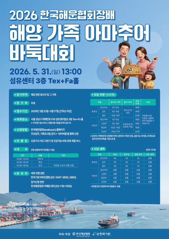 한국해운협회(회장 박정석)가 해양 가족을 대상으로 한 바둑대회를 개최한다.