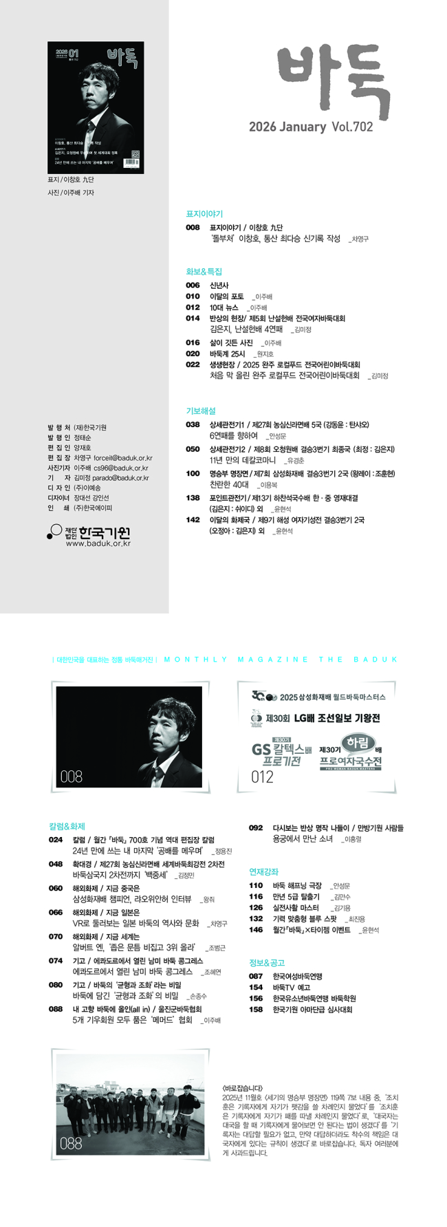 [칼럼]에서는 월간『바둑』700호를 기념해 이어온 역대 편집장 칼럼의 마지막 이야기를 전한다. 전편에 이어 정용진 전 편집장이 월간『바둑』과 함께한 시간을 돌아보며, 24년 만에 마지막 공배를 메운 사연을 들려준다.