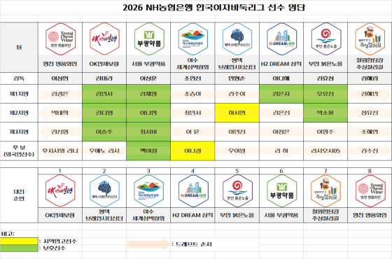 OK만세보령은 우에노 리사, H2 DREAM 삼척은 리허, 평택 브레인시티산단은 우이밍, 부안 붉은노을은 리샤오시(05년생), 영천 명품와인은 후지사와 리나를 후보선수로 지명했다. 이어 철원한탄강 주상절리길이 김수진 선수를 영입하면서 8개 팀의 2026 시즌 엔트리 구성이 모두 마무리됐다.