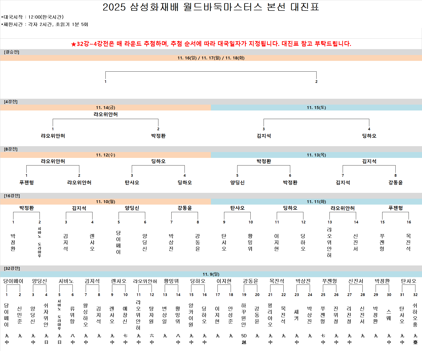 2025 삼성화재배 월드바둑마스터스 본선 대진표(1114)