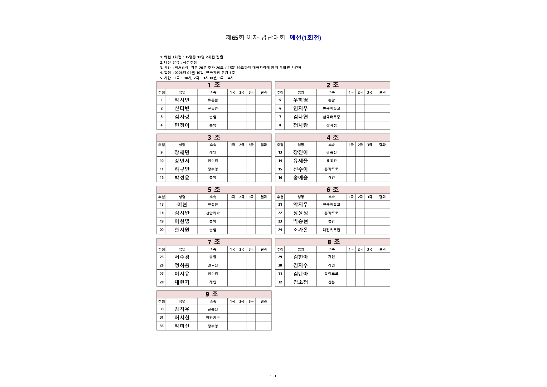 제65회 여자입단대회 대진표(예선1-1, 12/30)