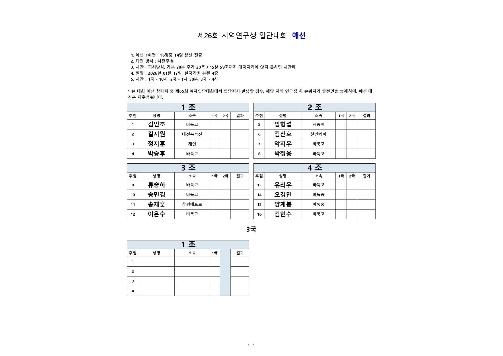 제26회 지역연구생 입단대회 대진표(예선1-1, 01/09)