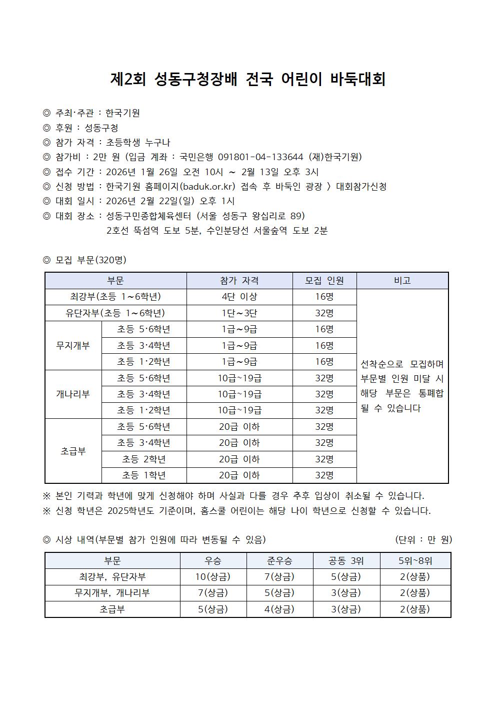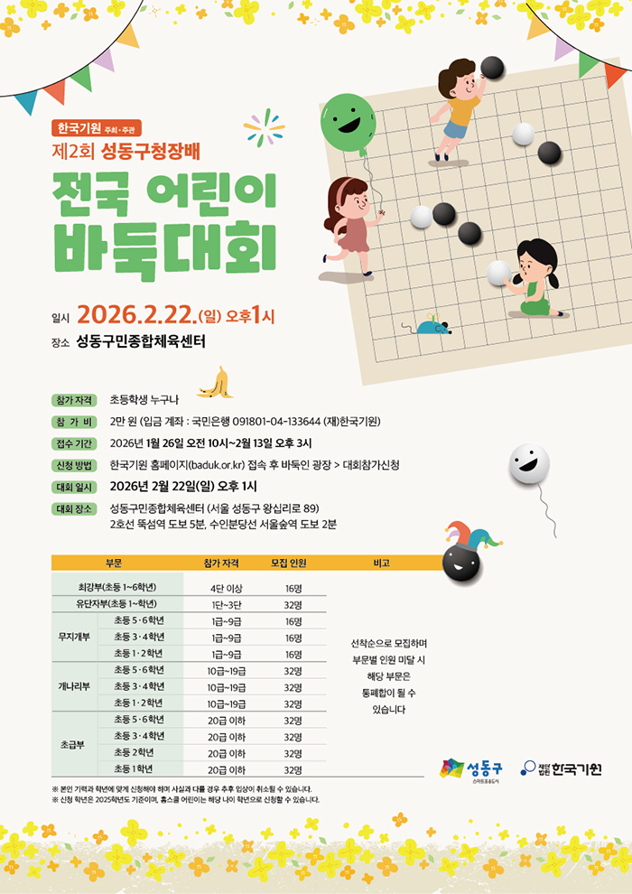 제2회 성동구청장배 전국 어린이 바둑대회 참가신청 바로가기(클릭)
