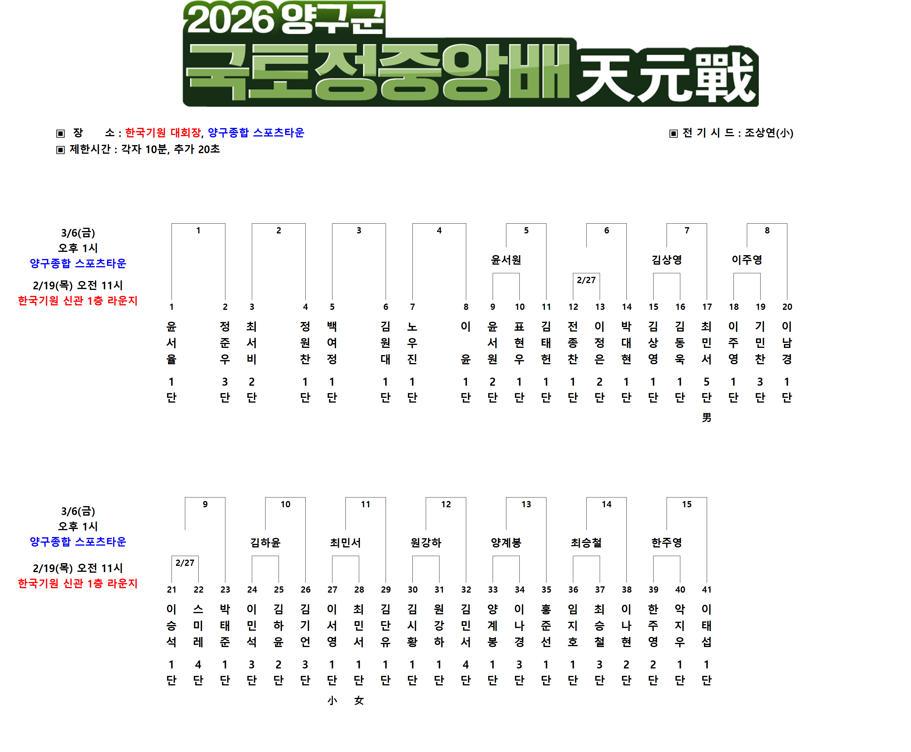 2026 양구군 국토정중앙배 天元戰 예선 대진표(0219)