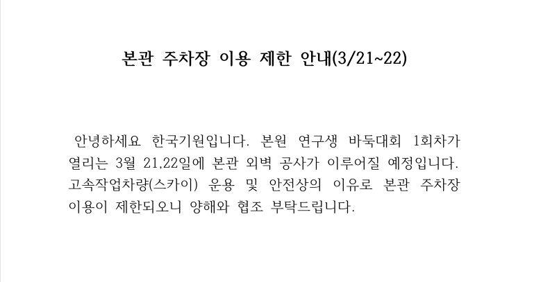 본관 주차장 이용 제한 안내 (3/21~22)