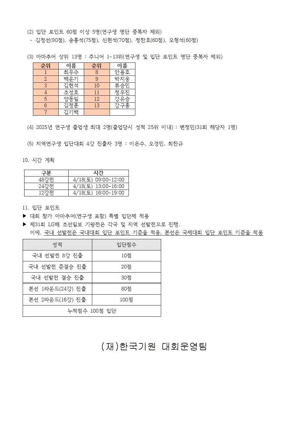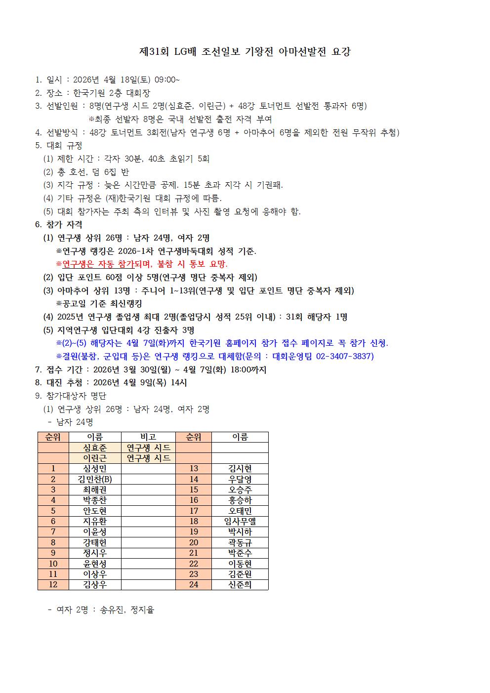 제31회 LG배 조선일보 기왕전 아마추어 선발전(명단 수정)