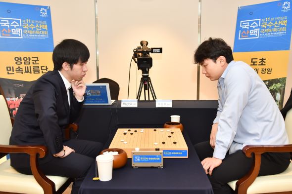 ▲안성준 9단(왼쪽 승)과 일본의 쉬자위안 9단의 본선 8강 대국 모습. |