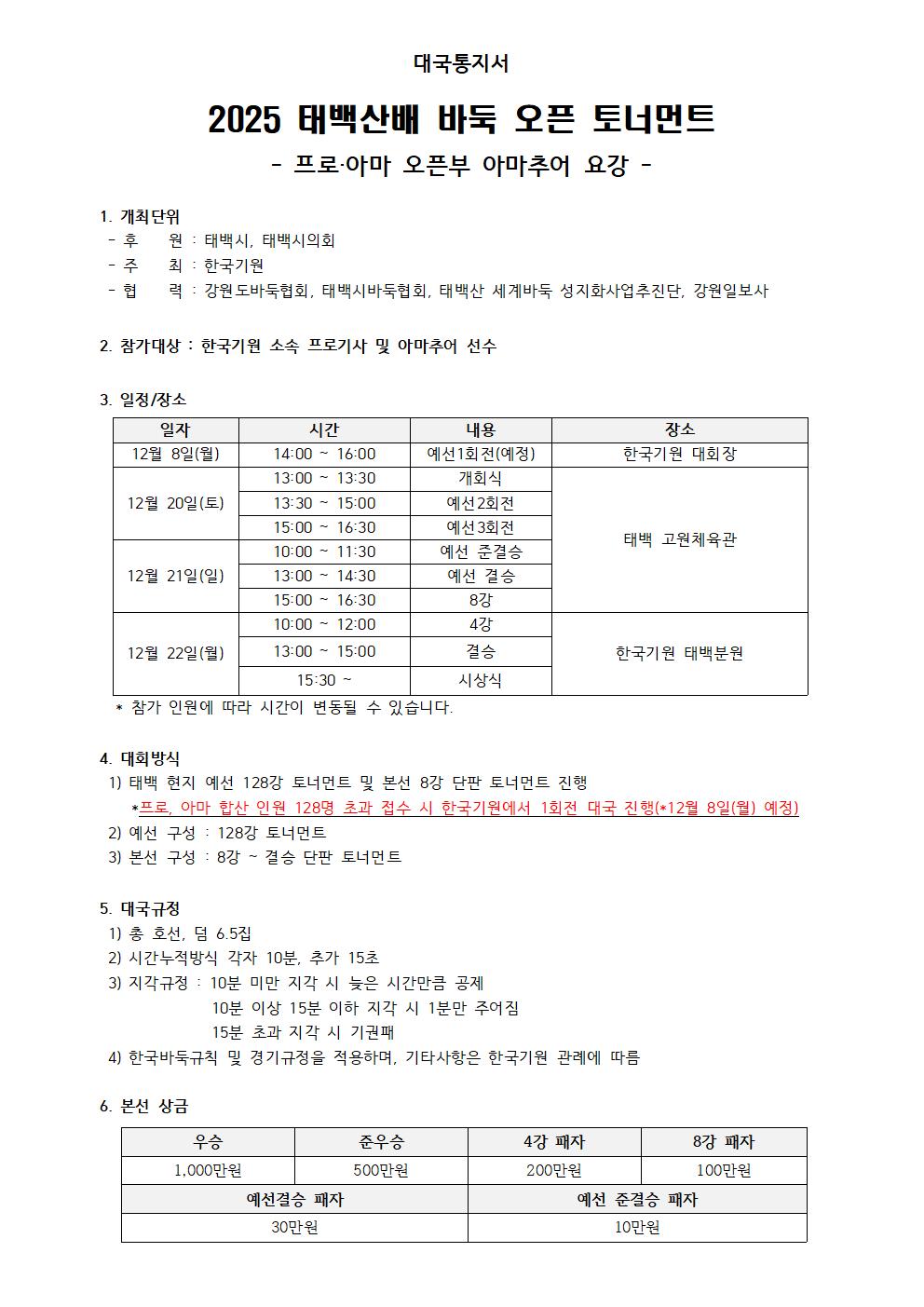2025 태백산배 바둑오픈 토너먼트 -프로아마 오픈부- 참가접수