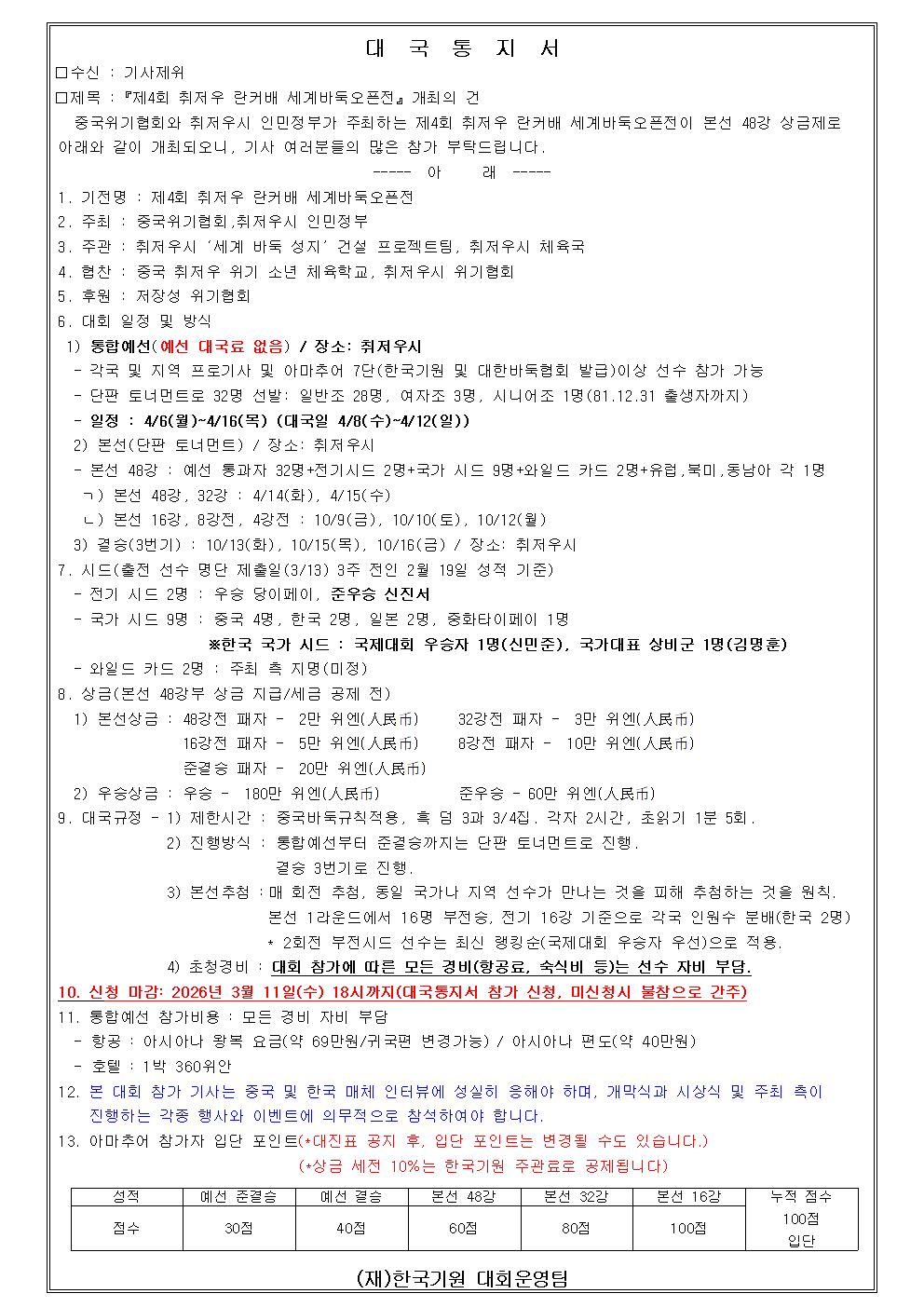 2026 양구군 국토정중앙배 天元戰 본선 대진표(최종)