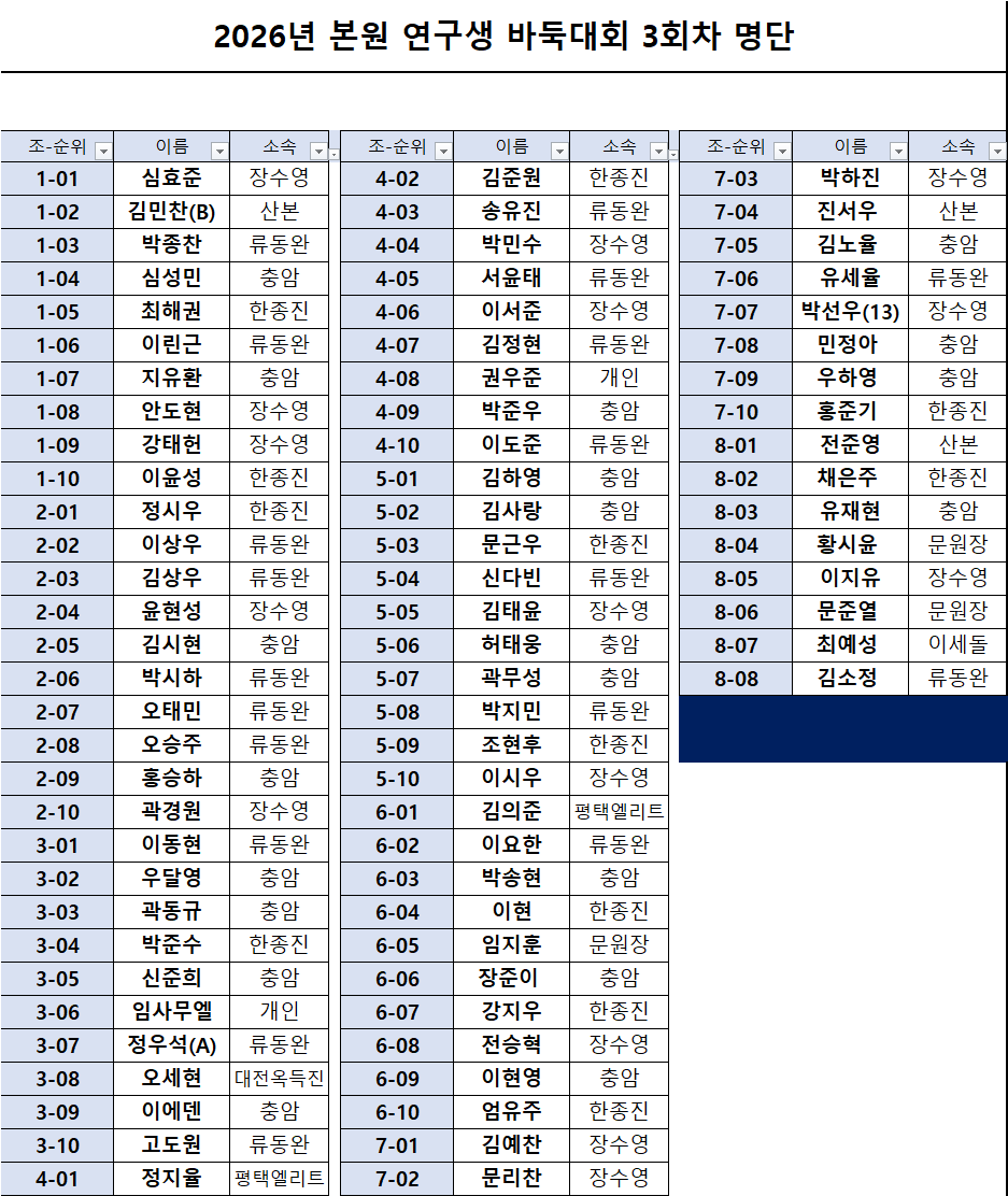 2026년 본원 연구생 바둑대회 3회차 명단